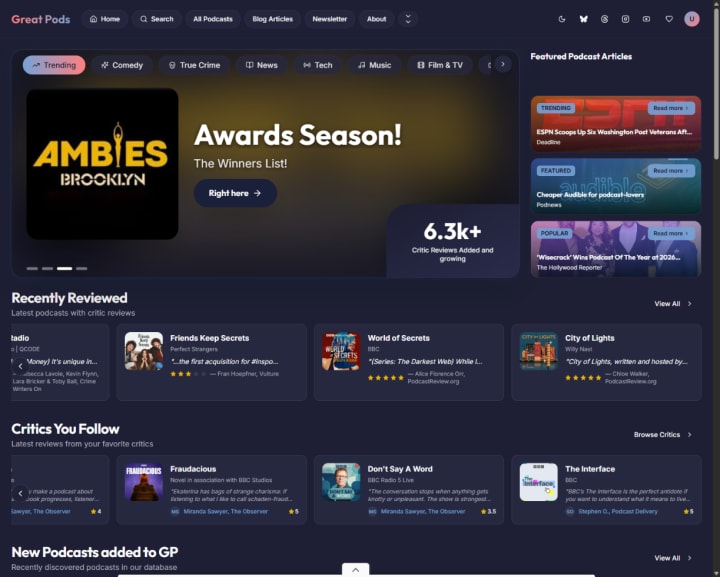 Great Pods is a podcast discovery platform built on critical transparency, bringing human editorial judgment back to a landscape dominated by algorithmic noise.