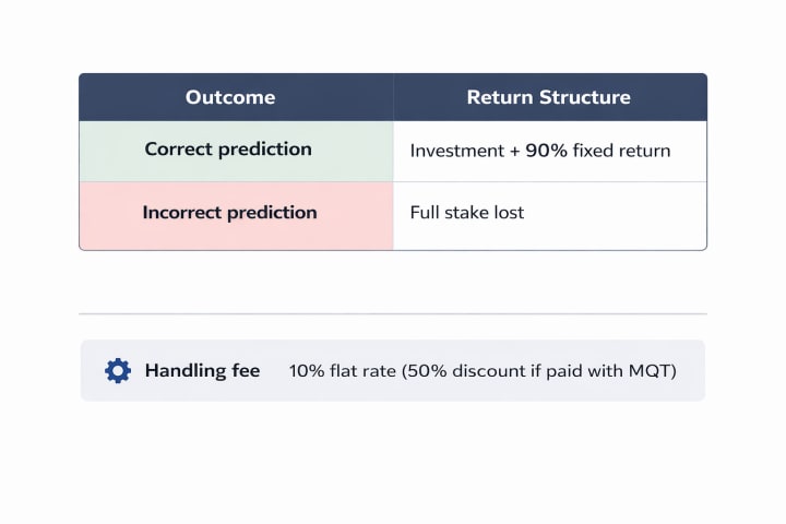 A fixed 10% handling fee makes it easy to know how much each contract cycle will cost. This consistency makes it less likely that people will try to take advantage of small inefficiencies in very short periods of time. Giving a 50% discount for paying with MQT at the same time creates an incentive system that helps the ecosystem stay in sync without changing how easy it is to get paid.