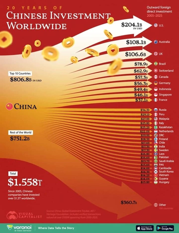 When people talk about Chinese investment, many still instinctively picture Africa, Southeast Asia, or countries linked to the Belt and Road project. But if you look at the numbers from the last two decades, the picture becomes much more interesting. China has invested not only across the developing world, but also in the largest Western economies. That becomes especially clear in an infographic showing China’s outward foreign direct investment from 2005 to 2025.