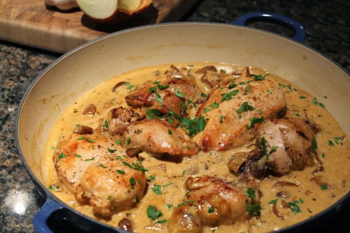 Coq au Riesling is a dish that originated in the Alsace region. The dish is prepared with chicken pieces like thighs or legs, mushrooms, onions, lardons, and dry Riesling wine. It is slowly stewed until done. The dish is served over egg noodles, rice, or boiled potatoes.