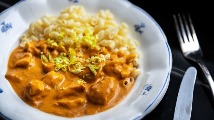 Chicken Tikka Masala is a British dish that was influenced by Indian cuisine. The dish consists of marinated, tandoor-cooked chicken pieces in a spiced tomato-cream sauce.