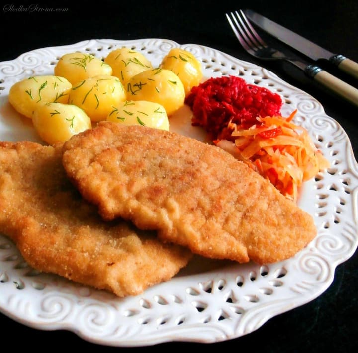 Kotlet z piersi kurczaka is a dish prepared with chicken cutlets coated in flour, dipped in beaten eggs, covered with breadcrumbs, and fried until crispy on the outside and moist on the inside. They are accompanied by potatoes, rice, or vegetables.