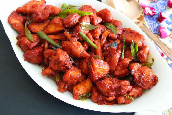Chicken 65 is a classic poultry dish that originated in Chennai, India. The dish consists of deep-fried chicken pieces that have been marinated in ginger, lemon, red chilies, and other spices. Once marinated the chicken is fried in hot oil.