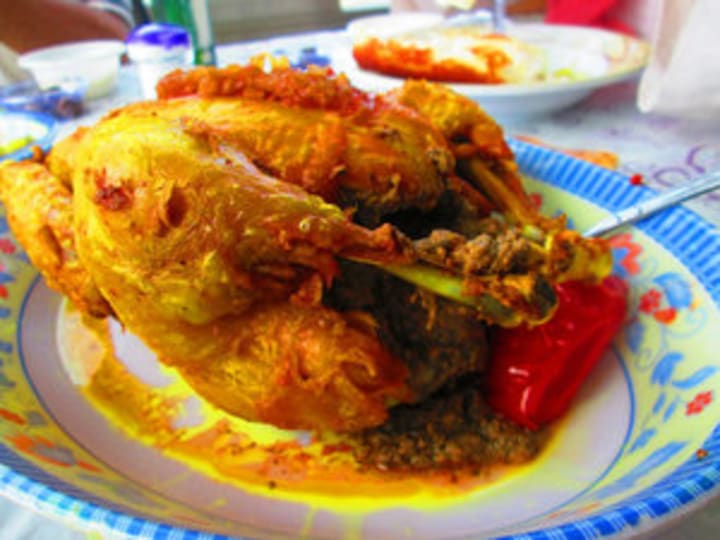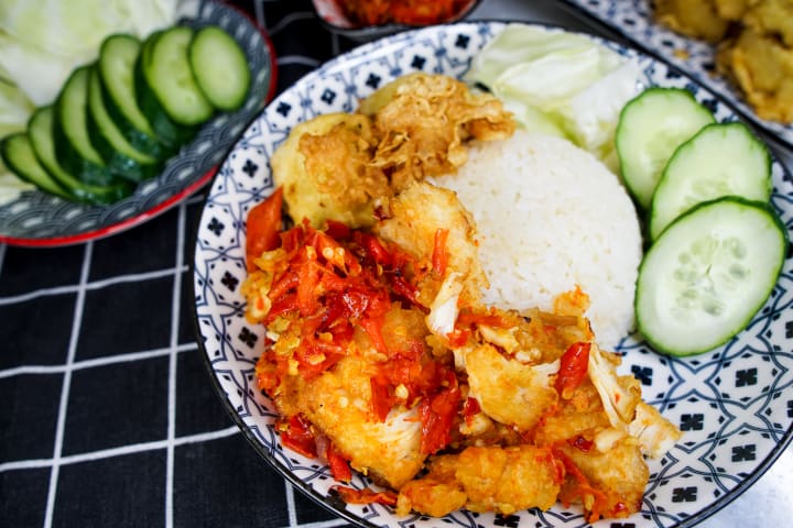 Ayam geprek is a chicken dish that originated in Yogyakarta, Java. The dish is prepared with chicken, eggs, flour, paprika, salt, pepper, and sambal. The chicken is sliced, seasoned, dredged in flour, dipped in beaten eggs, and fried until golden and crispy. Once done the chicken is placed on top of sambal chili paste and crushed with a rolling pin or pestle.