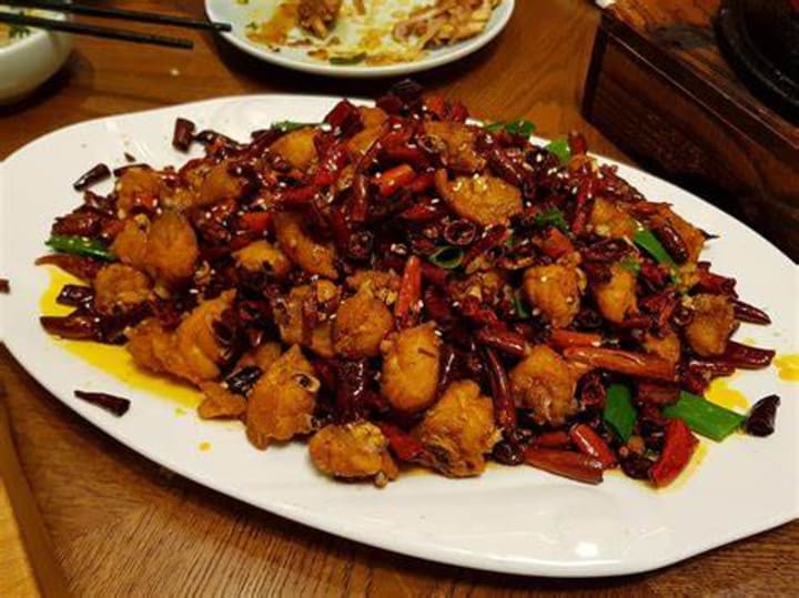 Chongquing is a popular Sichuan dish made with chicken and chilis. The chicken is on the bone, then chopped into small pieces, marinated, and deep-fried.