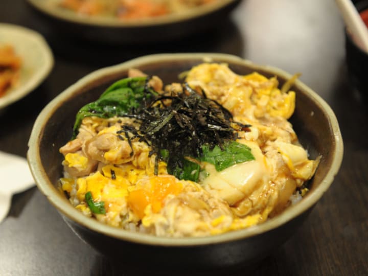 Oyakodon is a kind of poetically named dish that means “father and child”. It refers to the fact that both chicken and egg are used in the dish. Hot cooked rice in a bowl is topped with chicken, eggs, and chopped scallions. Once the eggs are poured over the rice, it helps to solidify the eggs.