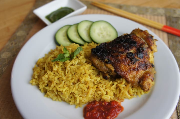 Khao mok gai is known as chicken buried in rice. The chicken and rice are heavily flavored with biryani spices like curry powder, coriander, cardamom, turmeric, cumin, and cinnamon.