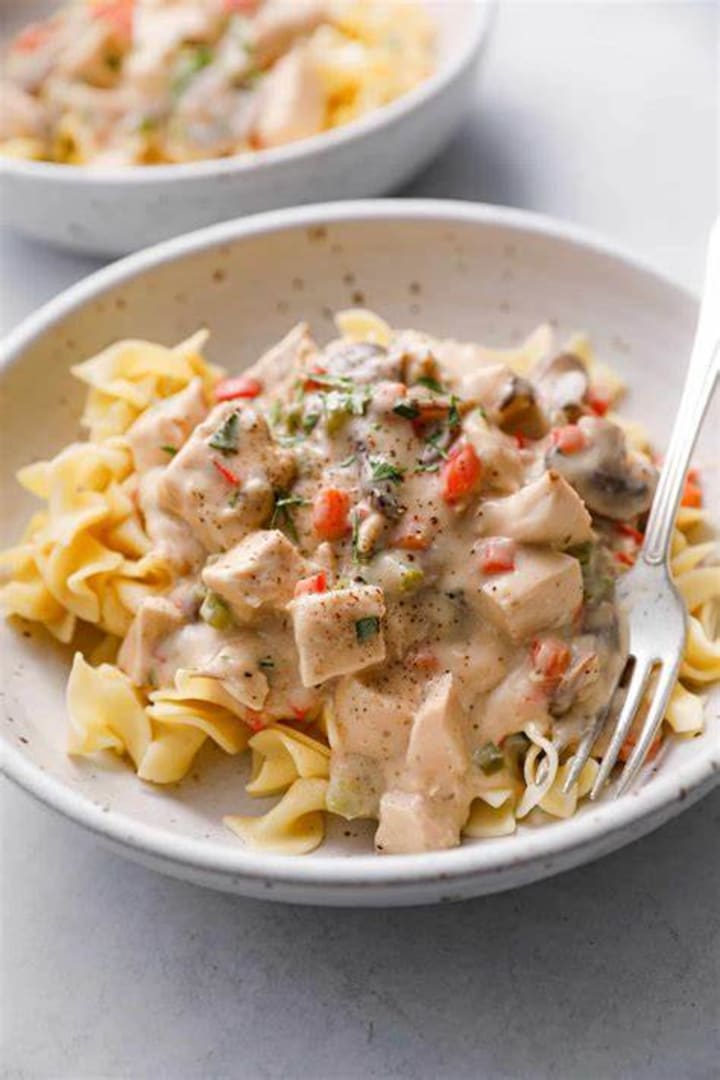 Chicken a la king consists of diced chicken, cream sauce, vegetables, and sherry mushrooms. It is served over rice, noodles, or buttered toast.