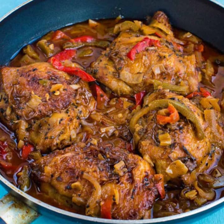 Brown stewed chicken is a spicy dish that consists of chicken pieces that have been browned and simmered in a rich gravy with onions, peppers, ketchup, and water. It is served with rice, peas, fried ripe plantains, and sliced tomatoes.