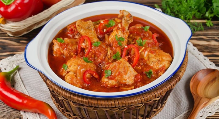 Ayam masak merah is a dish that is made with chicken pieces in a rich, spicy, and creamy tomato sauce. The chicken pieces are fried and then simmered in a sauce consisting of tomatoes, chili peppers, onions, garlic, and spices like galangal, garlic cloves, cinnamon, and cardamom.