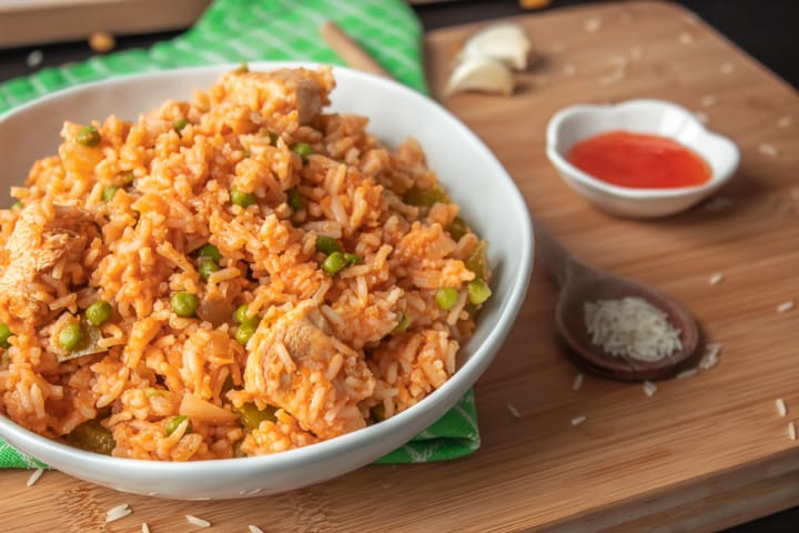 Arroz con pollo is a Spanish dish with Moorish influence. The dish includes chicken, rice, stock, beer, sofrito, and spices like saffron, cumin, and coriander. The ingredients are sauteed in a pan until the chicken is tender.