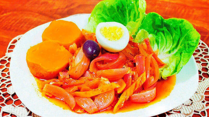 Escabeche de pollo is a dish that consists of browned chicken pieces in pickling sauce. The chicken is pickled with onions, vinegar, honey, and hot chili peppers. The dish is garnished with olives, and hard-boiled eggs served on a bed of lettuce.
