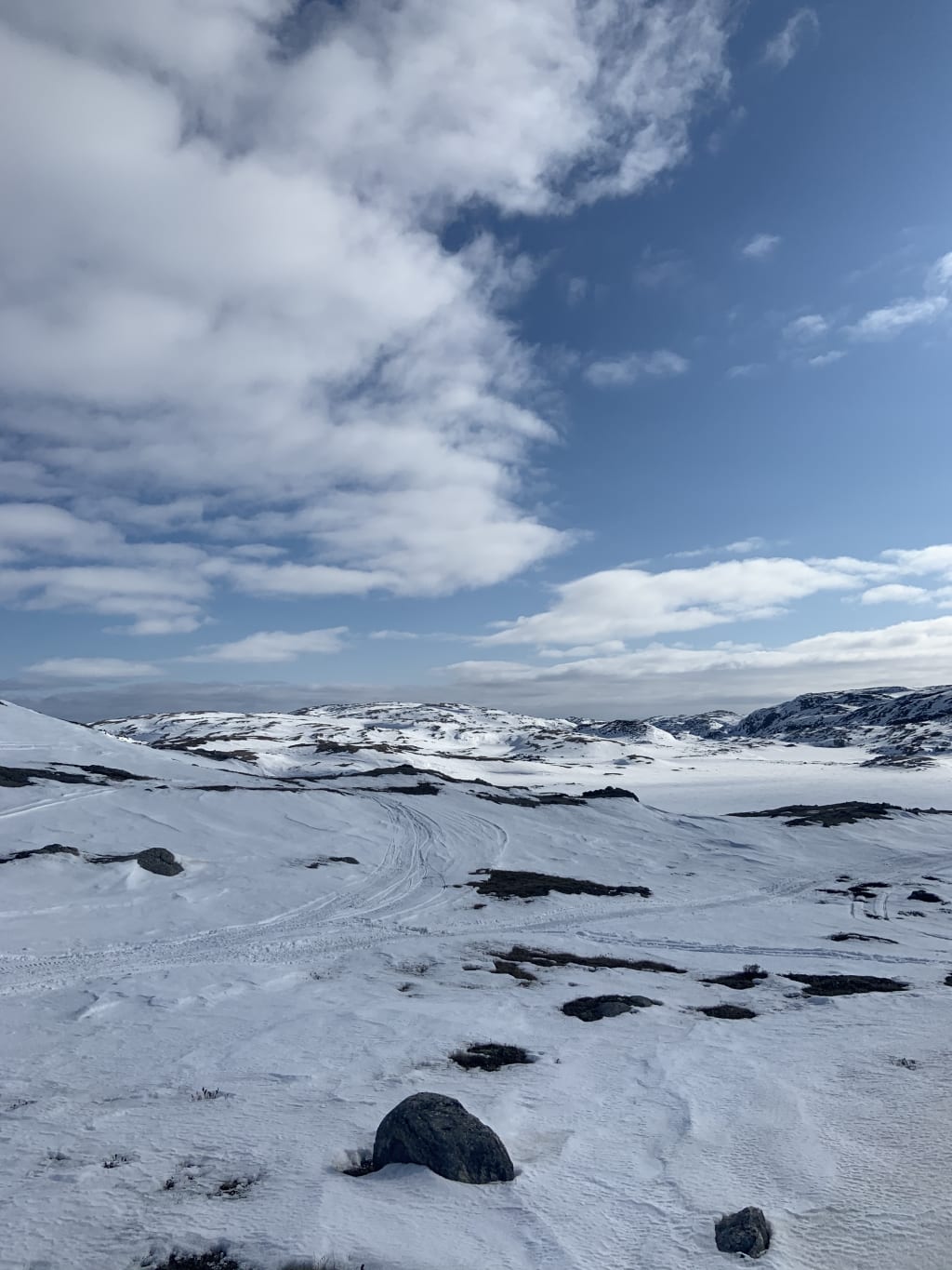 She is there. In her dark red sleeveless sweater vest. The sun hitting the snow, hitting her eyes. Her wrinkles sparkle in the brightness. And I think that her thin stocking material socks are not enough to keep her warm. And wonder, how she got to the other side of the world. To this land of ice and snow. I worry the breeze will catch her and she’ll catch a cold. That she might slip on smoothed-down snow. That she’ll have nowhere to sit down if the walk back to my house tires her out. Which it will. Heck, we’re at the edge of town. At least the walk is mostly downhill. Until it’s not. I wonder if I could carry her on my back. Or if someone would give us a ride. Maybe if we just make it till the airport. I wonder if she’s as entranced by the view as I am.