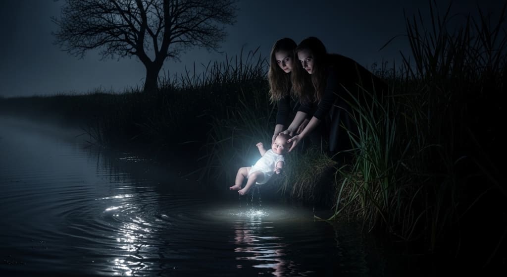 That very night, while the queen slept, they carried the newborn away and replaced him with a lifeless bundle wrapped in cloth. They took the child to the river and cast him into the flowing waters.