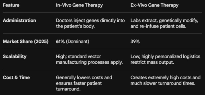 In-vivo gene therapy captures a 61% market share because it allows for direct patient administration. This highly scalable method bypasses the expensive, time-consuming laboratory cell modifications strictly required by ex-vivo therapies.