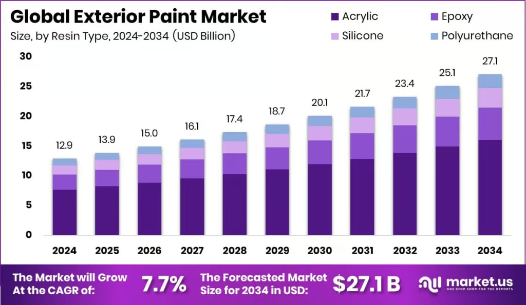 - The Global Exterior Paint Market is expected to be worth around USD 27.1 billion by 2034, up from USD 12.9 billion in 2024, and is projected to grow at a CAGR of 7.7% from 2025 to 2034.