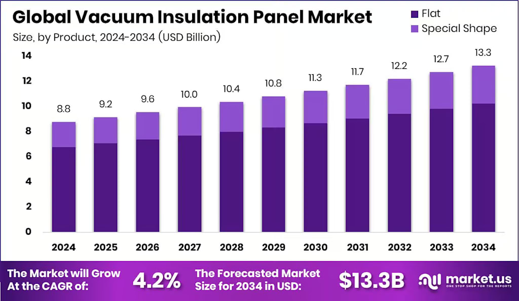 • The Global Vacuum Insulation Panel Market is expected to be worth around USD 13.3 billion by 2034, up from USD 8.8 billion in 2024, and is projected to grow at a CAGR of 4.2% from 2025 to 2034.
