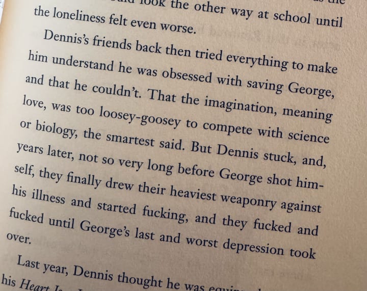 Themes of suicide and addiction litter the book. There's a lot of sadness, it's often something that feels empty but there's so much emotion going on that it overwhelms the reader. You can almost breathe in the whole book if you wanted to. I read it in one sitting and there's just so much to digest that often, I felt myself stop reading just to inhale deeply. The words, the atmosphere, the themes, the ideas and the philosophies. The character of George Miles is someone who the reader may not relate to but can definitely project their deepest desires and fears on. The more we know about him (his past, his family and his growth) the less we actually know (his psyche, his emotional state, his reasons). I'm being purposefully vague because I don't want to give it away. I desperately need you to feel this for yourself. Once you start reading it, you won't be able to put it down.