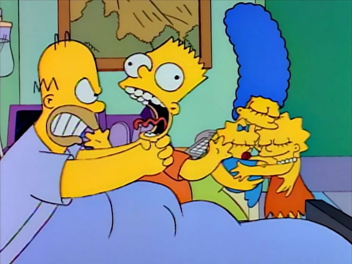 Lisa visits, fretting over not being close, but mentioning that there were times they connected, leading to a clip from Season Two's "One Fish, Two Fish, Red Fish, Blowfish," where Homer asks Lisa play her sax for her. Lisa does so in the present day as well, and afterwards, Bart appears and admits that he has been a troubled kid, but voices his gratitude to Homer for always being there for him (as we see in various clips, incluing the shaving lesson from the aforementioned Season Two episode). It's followed by Bart confessing to shaking up that beer can and causing the explosion as a prank. That, slowly, gets Homer out of his coma to give Bart the "Why, you little!" response.