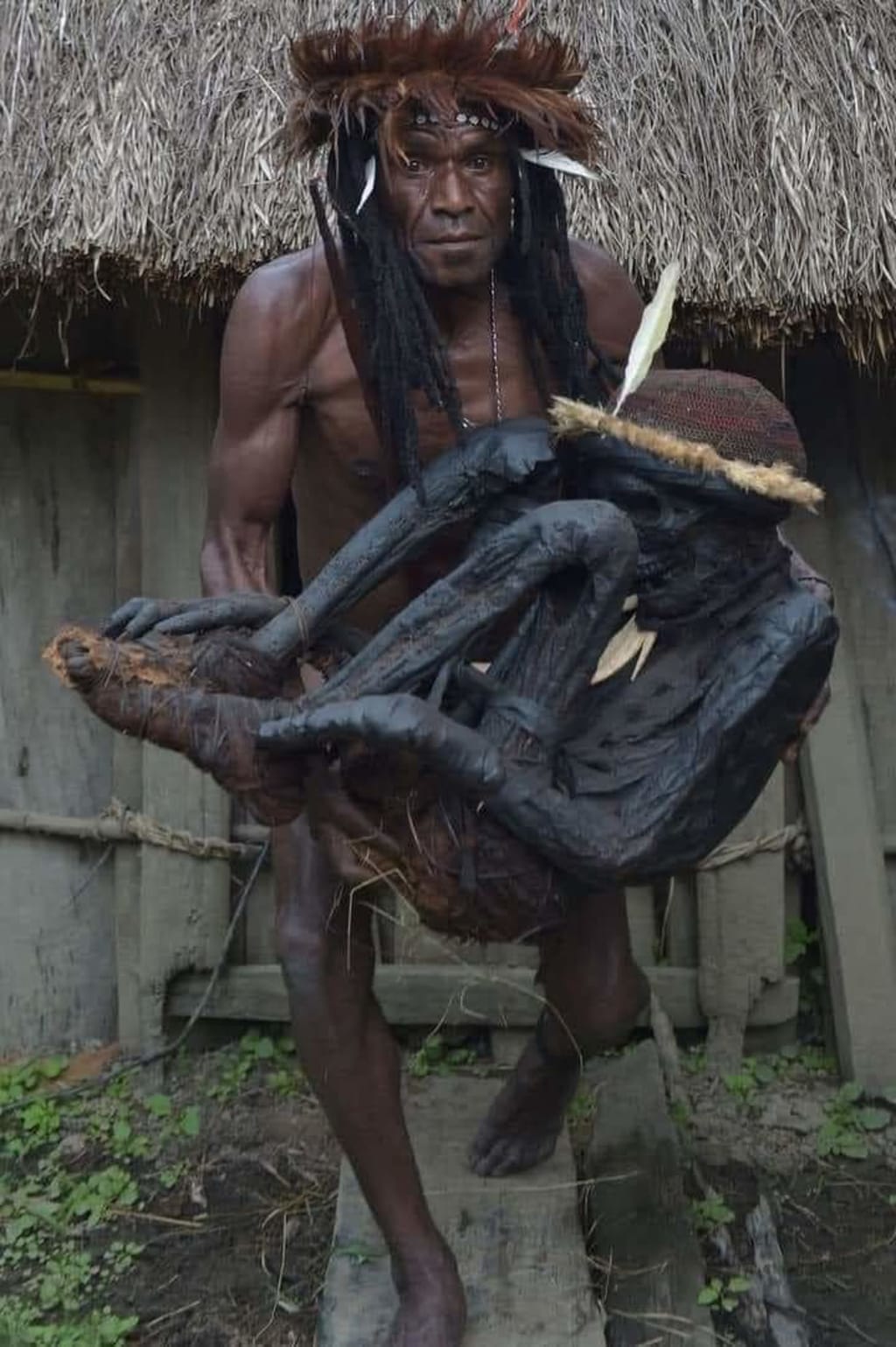 The shrunken, blackened figure he carries was Agat Mamete Mabel, a chieftain who ruled over this remote village in Indonesian Papua about 250 years ago. He was embalmed and preserved with smoke and animal oil after his death, an honour reserved only for important elders and local heroes among the Dani.