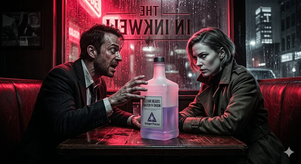 Nora didn’t answer. She didn’t even blink. She just stared at the white polymer bottle as if it were a live grenade with the pin pulled. The neon crimson of the Inkwell sign pulsed one last time, then flickered and died, leaving us in a grey, suffocating half-light. The jukebox had finally run out of coins, and the silence that rushed in was heavy, pressurized—the same silence I’d felt in the sterile hallways of the Antogen hangar.