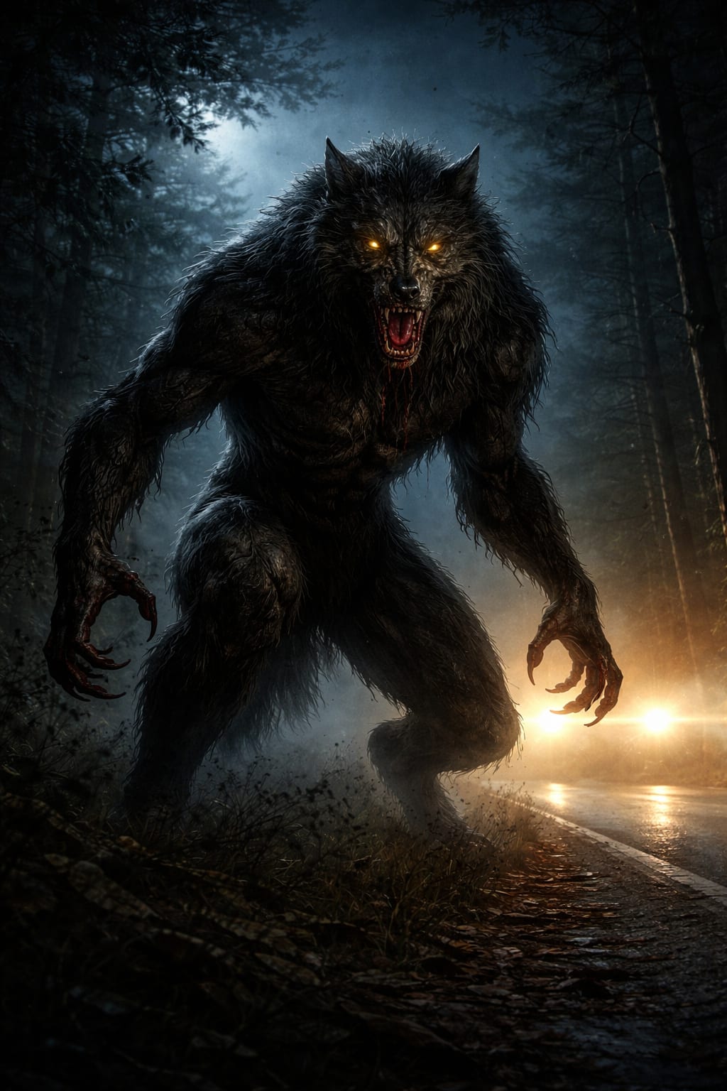 What rose from the roadside did not stand the way a man stands. It unfolded. Shoulders rolling back, spine straightening, reaching a height that no man could reach. Muscles moved beneath the fur like something massive working beneath the dark water's surface. Its head turned toward her, slowly, deliberately, and its eyes caught the glow of her headlights with that cold, terrible brightness.