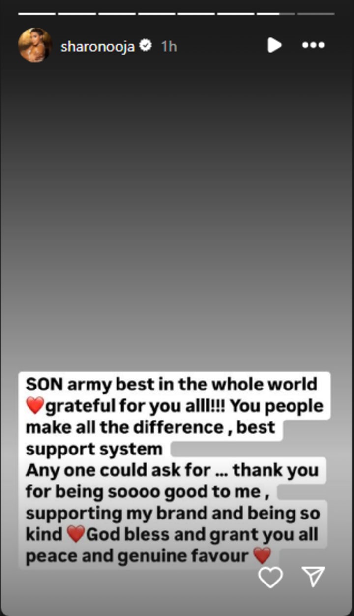 SHARON OOJA: SON army best in the whole world. Grateful for you all!!!! You people make all the difference, best support system any one could ask for. Thank you for being soooo good to me, supporting my brand being so kind. God bless and grant you all peace and genuine favour