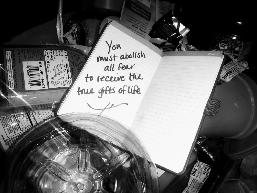 Joselyn found herself in a dumpster, anxiously digging for something while using all the curse words at once. Then it struck her that she had no clue what she was looking for. This realization paired with the pungent aroma made her chuckle, since that was a suitable metaphor for her life. Standing knee-deep in the neighborhood filth, unsure of what she was searching for- now that was poetic! Joselyn’s twisted but upbeat perception of life helped her get through tough times. As she kept digging, she slowly realized she was dreaming. She then saw a small black notebook laying open on the other end of the dumpster. The open page read, “You must abolish all fear to receive the true gifts of life”.