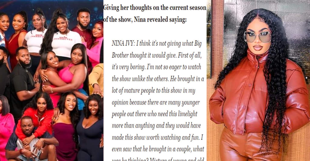 The ninth and current season of Big Brother Naija is underway and one of the show's alumnus is giving her thoughts on the current season. Granting her interview through a Whatsapp chat with Vanguard Newspaper reporter, Potpourri, fourth runner up of Big Brother Naija Season 3, Nina Ivy, revealed her thoughts about the current season expressing that she finds the show boring, and explaining why. Here's what Nina had to say.