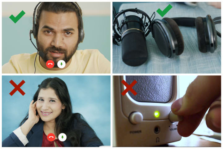 2) Tech Setup: Invest in a good home tech setup— noise cancelling headphones, high-quality microphones (or a combo headset), and a dedicated Webcam. Even though these come standard with laptops, these accessories are often of better quality/clarity.