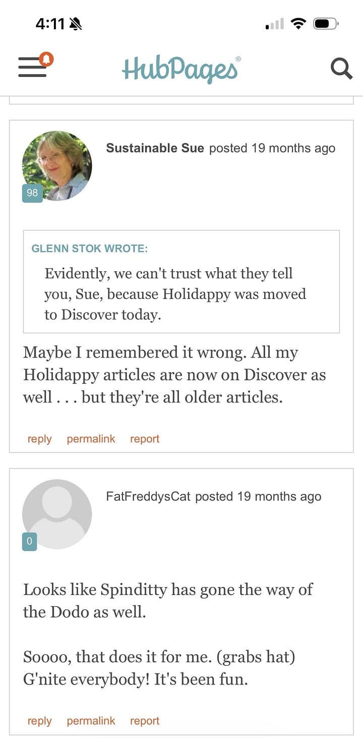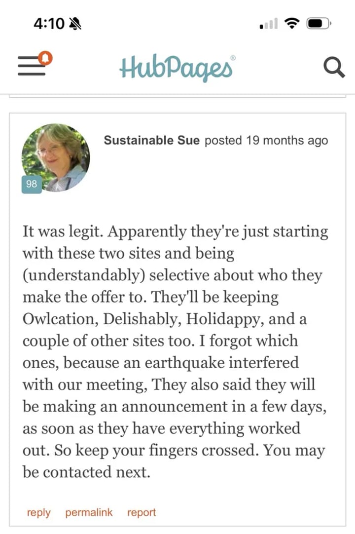 This is an important part of the conversation. In the image above, Sue puts the blames on herself rather than on TAG. Perhaps she misremembered which niche sites would continue operating. (FYI: There were two announcements that sites with HubPages would become standalone endeavors with TAG. The first occurred in 2024 with Pethelpful and DenGarden. The second occurred a few months later in 2025, when the last remaining niches got the boot to standalone endeavor territory. On a separate note, several vertical niche sites, including Holidappy and Spinditty, were dumped back into Discover.HubPages, not turned into TAG publications where only hired contributors published content.) In the above image, Glen is likely right: we can’t trust what they tell you.