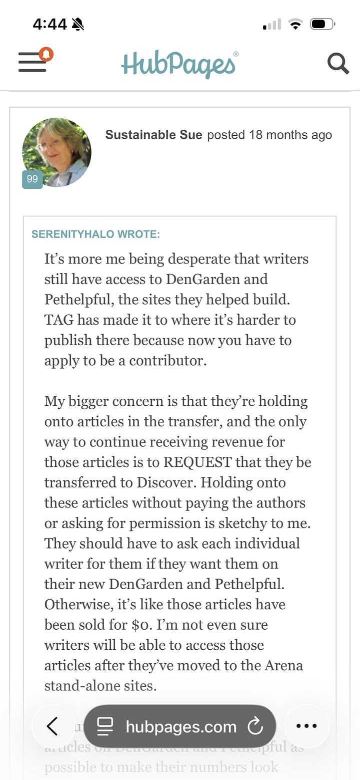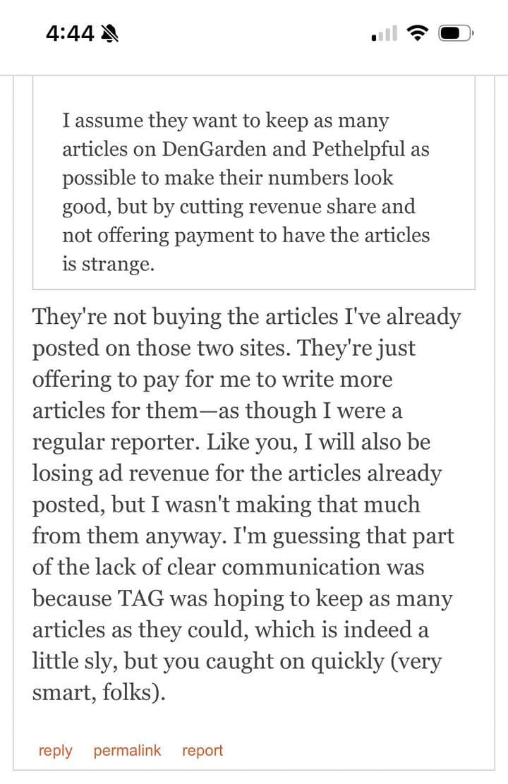 Who is SerenityHalo? That would be me! I called out the default transfer process to the new DenGarden and PetHelpful sites as sketchy. I made a point that TAG should have to get permission for every article it wanted to take for its new standalone endeavors. People were essentially forced to sell their articles for $0 to stay on the niche sites. And not everyone reads announcements posted in the forums or keeps up with all the HP emails, so there was likely content taken over without people’s knowledge or permission. Silence isn’t consent.