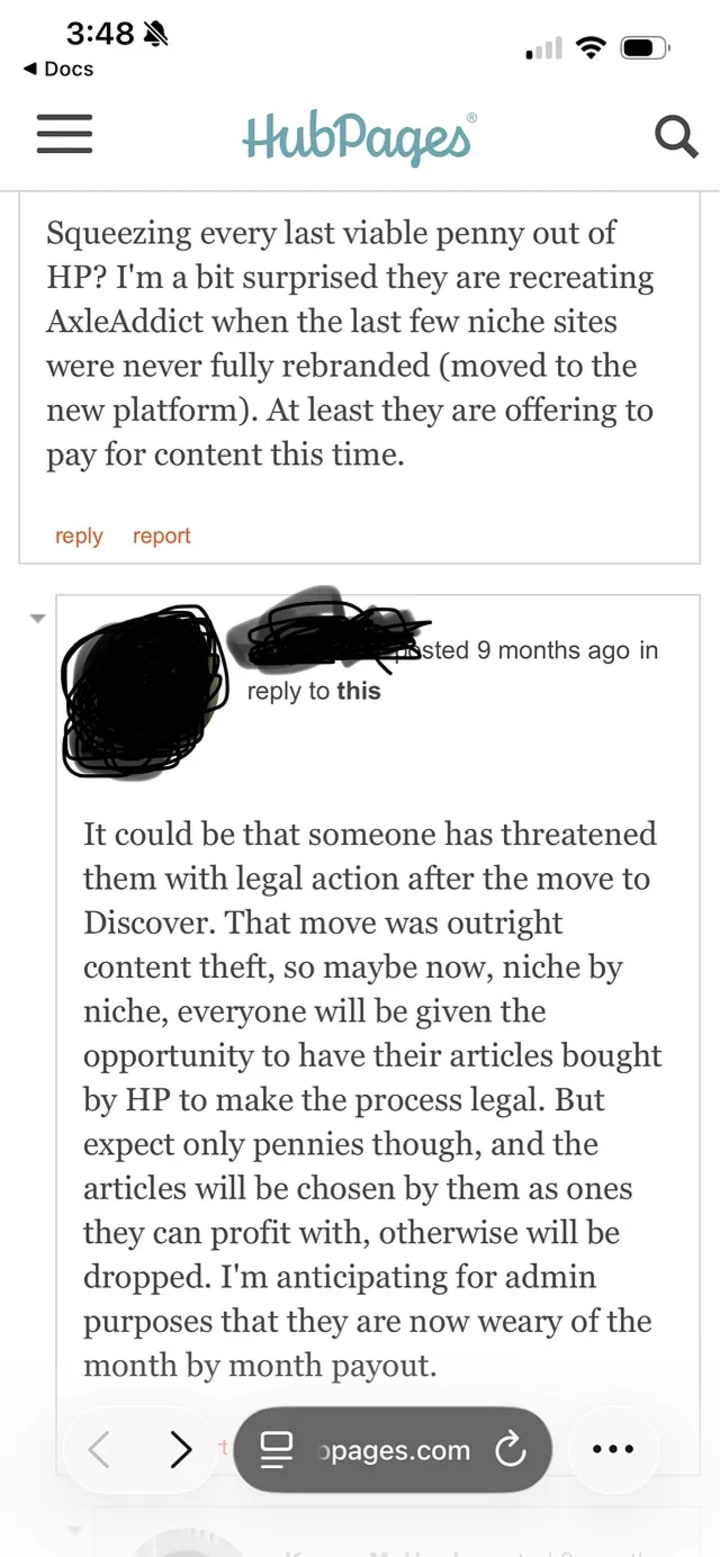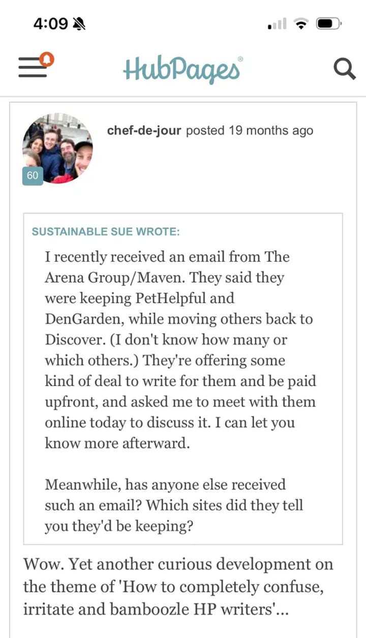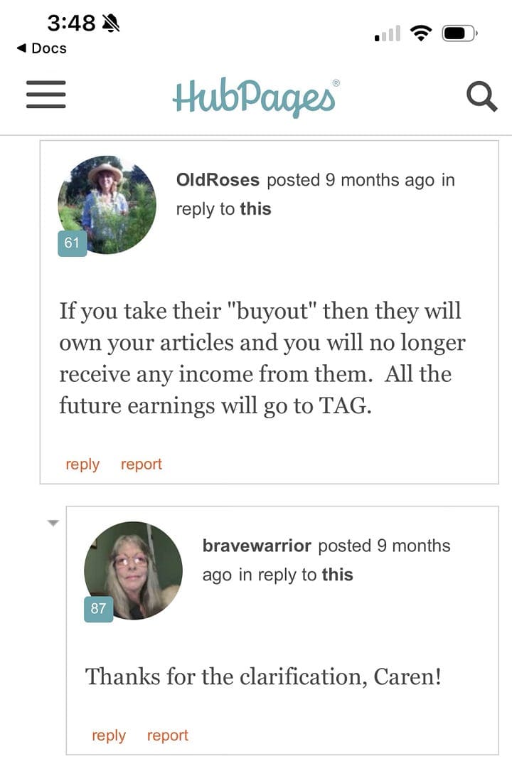 Another pertinent question here: Why was it “understandable” that they were being selective? There were plenty of writers on HubPages who created high-quality and high-performing articles. It seems to me that "selective” was a synonym for sneaky. Considering that less than a year later, there were allegations that TAG mined old HubPages articles and used AI or other software to duplicate those articles, it is my impression that sneaky is a suitable interpretation.