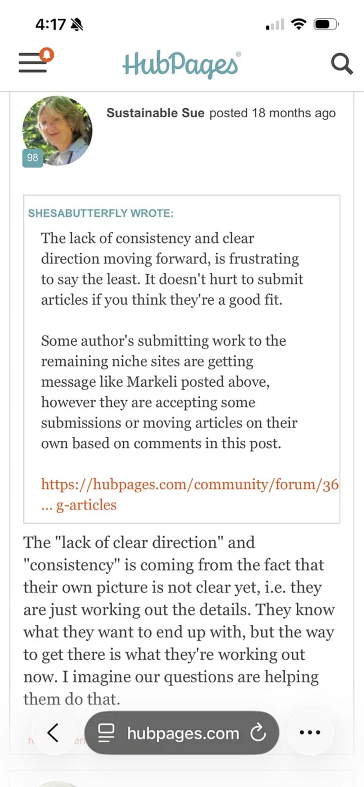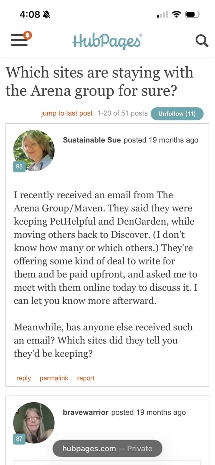 - Horspool, Susette. “Which sites are staying with the Arena group for sure?” HubPages Forums, August 2024. <hubpages.com/community/forum/361682/which-sites-are-staying-with-the-arena-group-for-sure.>