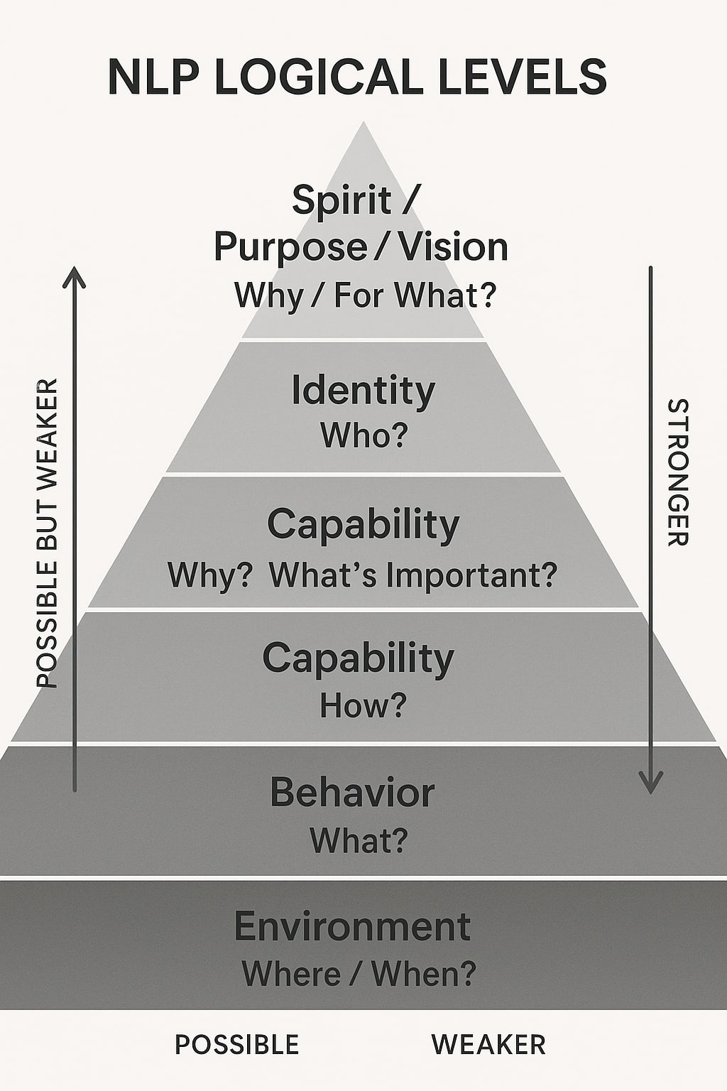 The NLP Logical Levels model reminds us that change is more than just doing things differently (Behavior) or learning new skills (Capability). The deepest, most lasting change often happens within us—at the level of our beliefs, identity, and even our life's purpose.