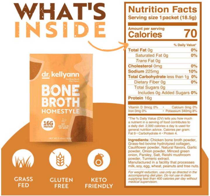 The grass-fed collagen protein found in Dr. Kellyann's bone broth has power peptides and amino acids that can help boost metabolism, reduce food cravings, and satisfy hunger. Their bone broth packets are a convenient on-the-go option, with each packet containing a serving of bone broth that can be easily mixed with warm water. Overall, Dr. Kellyann's bone broth is a high-quality product that can help you reap the benefits of bone broth in a simple and convenient way.
