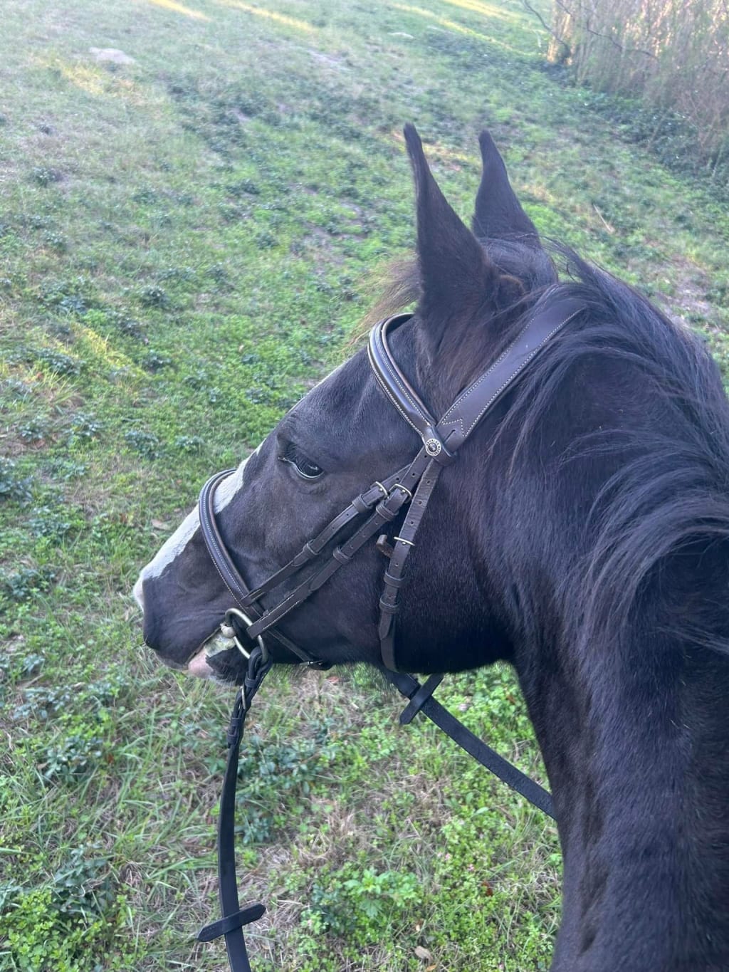 This is Salem, a ten year old Dutch Harness horse. He's friendly and easy to work with, and loves people. Salem gives kisses. When he finds your face. He's blind. This is a photo that I took on one of our rides.