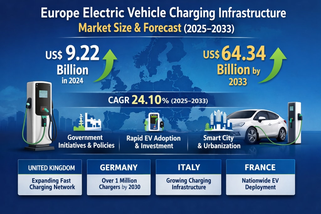 According to Renub Research, the Europe Electric Vehicle Charging Infrastructure Market is projected to reach US$ 64.34 Billion by 2033, up from US$ 9.22 Billion in 2024, expanding at a compound annual growth rate (CAGR) of 24.10% between 2025 and 2033. This remarkable growth is being driven by strong government incentives, rapid EV adoption, increased investment in infrastructure, and the presence of major electric vehicle manufacturers across the region.