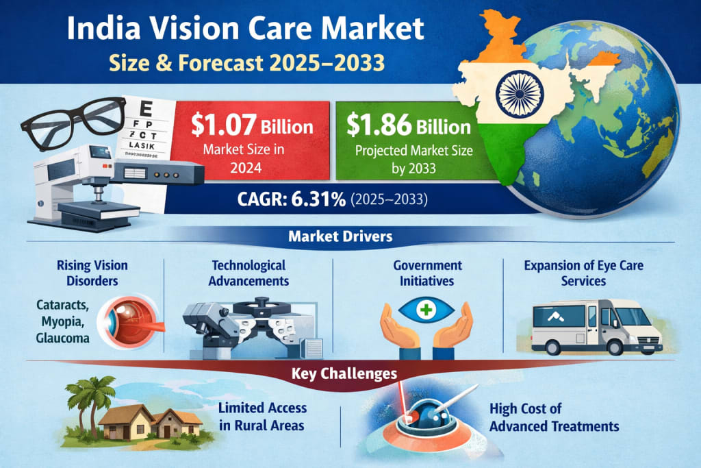 The India Vision Care Market is witnessing steady growth as awareness regarding eye health continues to expand across the country. According to Renub Research, the market was valued at USD 1.07 billion in 2024 and is projected to reach USD 1.86 billion by 2033, growing at a compound annual growth rate (CAGR) of 6.31% between 2025 and 2033.