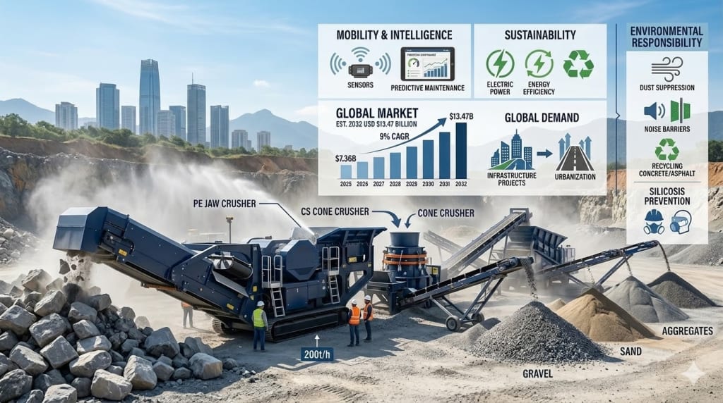 In 2026, stone crushing is a tech-driven sector. Growth is fueled by global infrastructure demand, while mobile, smart, and eco-friendly designs define the future. Success now requires balancing high-capacity production with automation and urgent environmental responsibility.