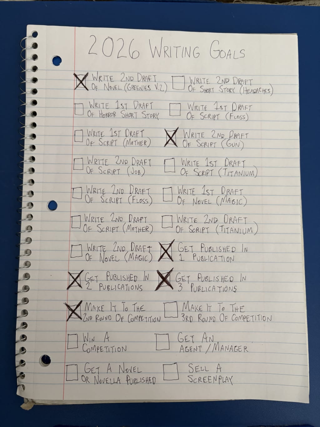 Another writing goal accomplished! And I snuck this one in just before March was all done with! This one is labeled as Write 2nd Draft of Script (Gun) because I like writing in halted speech patterns… and I was working with limited space. But to lengthen it out here where I got some extra leg room, the goal was to write the 2nd draft of my script, “Son of a Gun.”