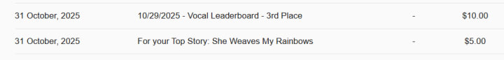 This is my coffee money from Vocal since October last year, and the time I was unable to publish thanks to a system limit/fault which could have been fixed in five minutes.