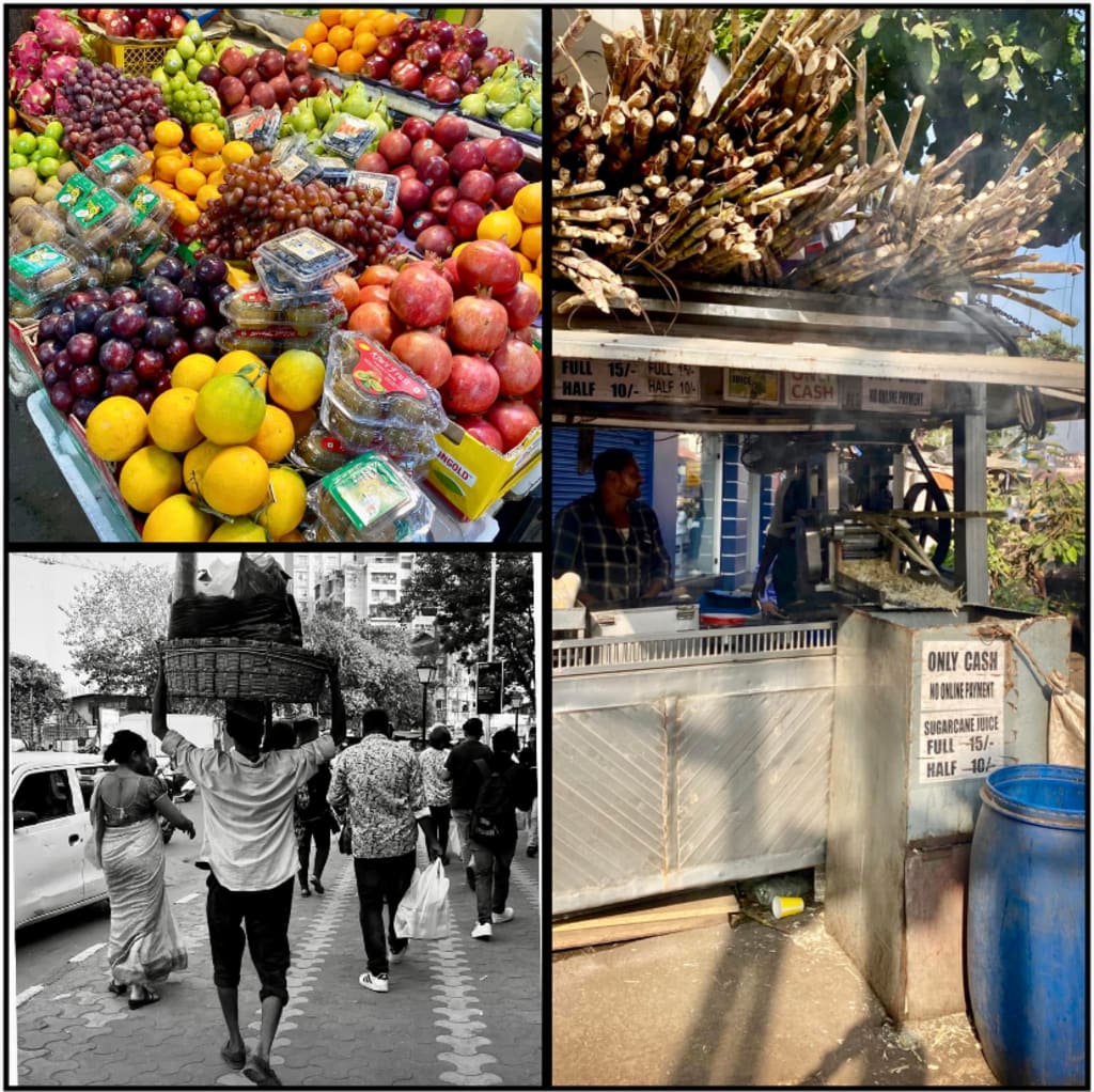 Food stalls line the streets chutney sandwiches, sugarcane juice, samosas, mirchi dunked in oil, badam milk, cutting chai. Fruits and homegrown vegetables sit in colourful carts, rinsed lightly in water that begins mildly brown and turns wildly black. The produce emerges shiny, polished, almost photoshopped.