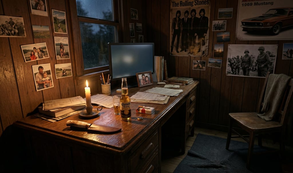 There’s a dark rug on the floor, flat and smooth, the color of an angry sky that hasn’t broken open yet. My chair catches on it whenever I stand up to do the things that pull me away from this space—laundry, errands, and work that doesn’t require a pen. Those are daylight tasks. The desk is for late nights, when the house is quiet and nobody’s asking anything of me.